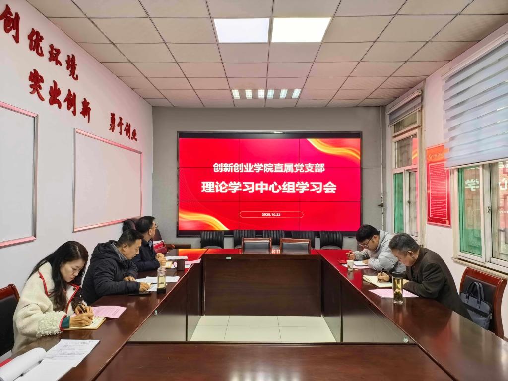 10月22日下午,创新创业学院直属党支部理论学习中心组召开集体学习研讨会,直属党支部书记靳岷主持会议,直属党支部理论学习中心组全体成员参加学习,图书馆党总支书记马晋宏、学习秘书潘仲光列席会议。